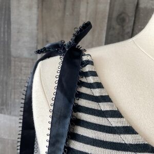 This adorable 1920s flapper costume has a cream and black horizontal stripe pattern with ribbons on the shoulders and a bow at the drop waist. Size based on measurements. It is handmade and is in excellent condition!
