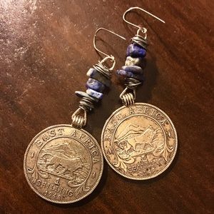 Unique coin and blue stone bead wire wrapped earrings. Worn once