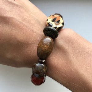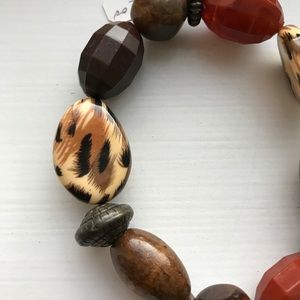 Handmade earth tone (brown, red, cream/beige, black) beaded bracelet. The beads are chunky, and take many different shapes, patterns, and sizes. The bracelet is on an elastic, and stretches to fit most ring sizes. This bracelet is new with tags, and has never been worn. Perfect for a Fall / Autumn wardrobe!