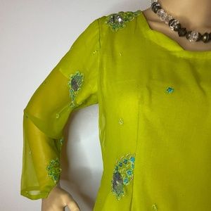 Handmade gorgeous bright lime sheer green silk chiffon long sleeved tunic with cotton short sleeved cream lining underneath. The sleeves are sheer sand the bottom has about two inches of sheer as well. The sides are slit high to make it a sari tunic. This dress is hand embroidered with turquoise shiny sequins and metallic silver sequins as well. It’s a leaf floral pattern scattered around the front and back. This is super glam and super chic! It can be worn as a top or dress!