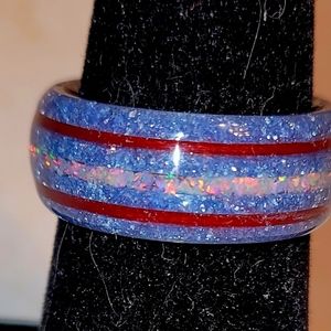 One of a kind epoxy ring. Light blue epoxy with crushed peach opal inlay in the center and two red thread inlays on the sides. Size 6