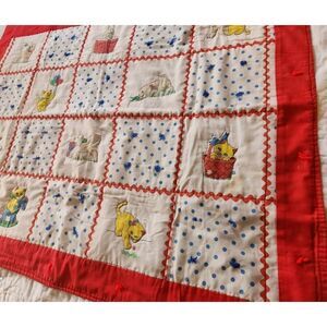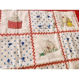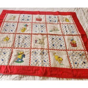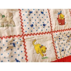 ▪︎DESCRIPTION: Homemade baby blanket featuring kitties and puppies. Red, blues, and yellow