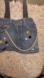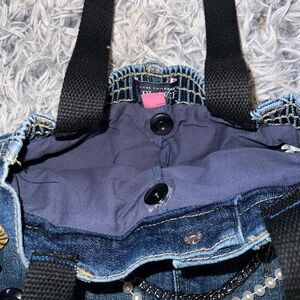 Chic denim shoulder bag featuring black straps and stylish embellishments. Perfect for a trendy look. ⭐️ One of a kind handmade by me denim mini skirt purse