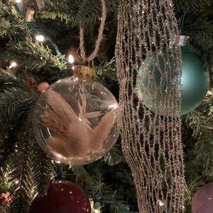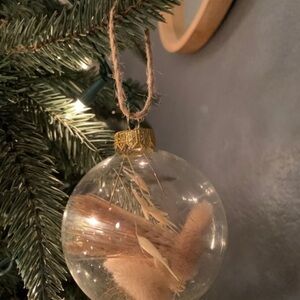 Glass ornament contains all wheat colored dried plants. Unique gold cap. And tied with vintage twine. Beautiful on Xmas trees or just in a window. Larger sized bulb.