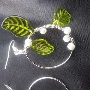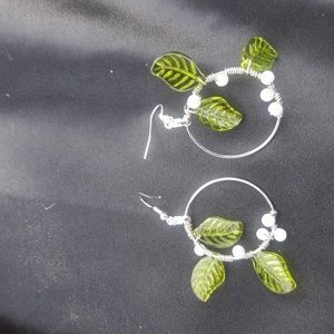 Green glass leaves, white pearls and silver wire wrapped on med. hoop, fish hook