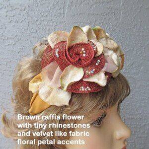 Handmade headband with raffia flower, floral petals & rhinestones, Beige & brown