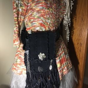 All handmade hip bag with fringe. 3 pockets fit large cell phone. Belt is 40 inch adjustable. Black denim