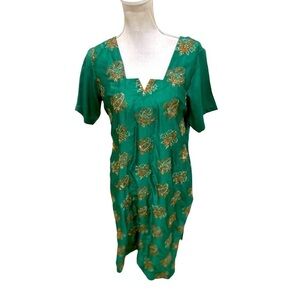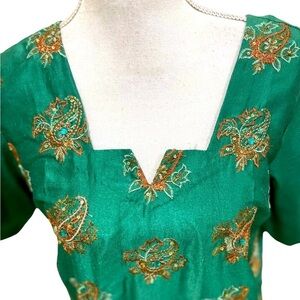 Handmade in India embroidered silk tunic dress & scarf. Green and rust. Square neckline. Side slits. Matching pants available in separate listing. Wore once.