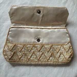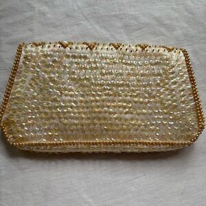 Chic cream satin Evening Clutch Iridescent sequins with pearl accents. Made in Japan. 1950's