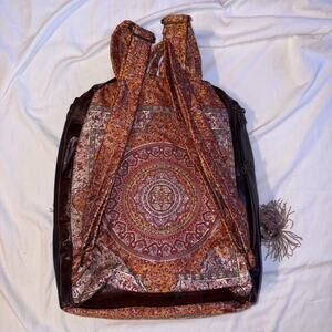 Beautiful handmade in Pakistan boho woven backpack crafted from multicolor tapestry fabric in rich earthy red, orange, and gold tones, accented with brown faux leather trim. The unique mandala-style pattern and artisan design make this backpack stand out. Spacious enough for everyday use, festivals, travel, or casual bohemian looks.