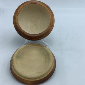 Handmade in Poland, this round wood box features a carved flower design on the lid. Pre-owned, good condition.