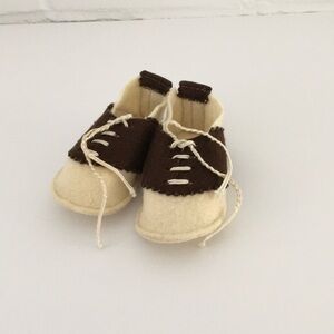Cream and brown Classic felt saddle shoes. Laces. These shoes could be worn by a doll or a baby boy. Total length of sole is 4”.
