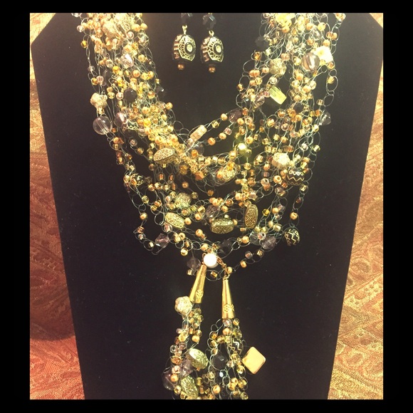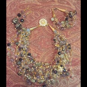 This is a lovely three piece set all handmade with with assorted crystals, shec, glass and marble beads. This unique piece would look great for any occasion. Order yours today remember it's all handmade and one if a kind!