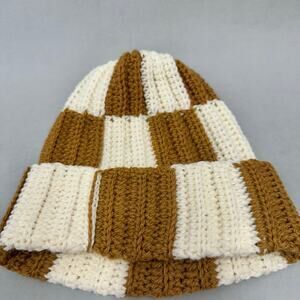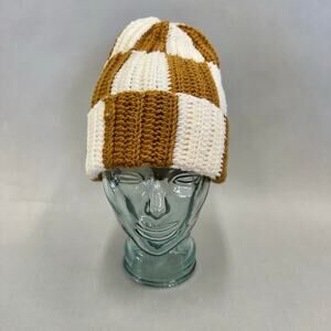 Handmade knit colorblock ivory and golden mustard checkered stocking hat beanie