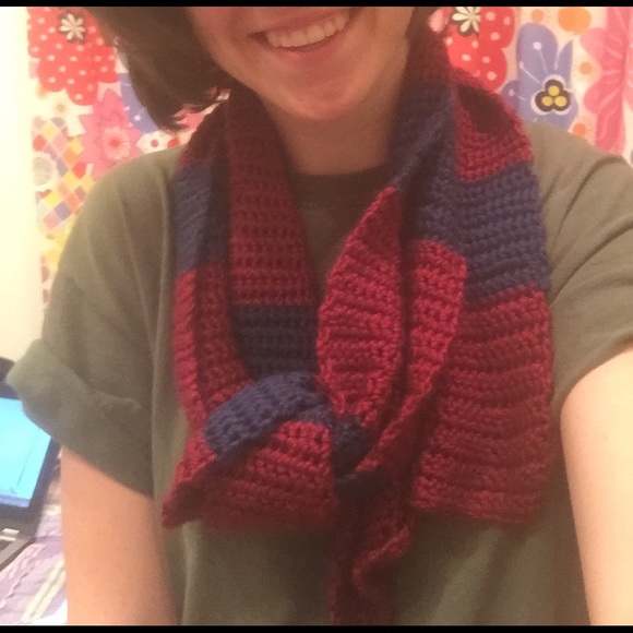 What's so great about this scarf? I MADE IT! I learned how to crochet a few years ago and got HOOKED(pun)! This scarf is a little over 6ft long and about 6 inches wide. It is made with SimplySoft yarn which makes it soft and pretty stretchy. It is burgundy and navy blue. If you have any questions please comment (: