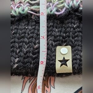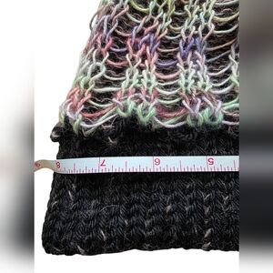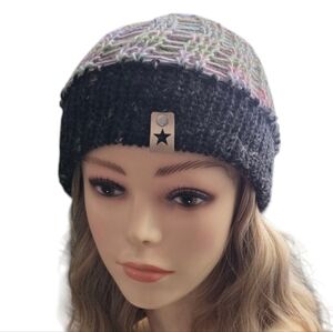 Handmade knitted beanie toque with knit mesh overlay vegan leather tag slight slouch multicolored