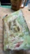 I made this journal using lots of bits of vintage papers to cover the page. Then I added some paint and Jesso to tone it down. I added a couple of pockets with places to journal. Every page can be journaled upon some pages have angels some are just full of mixed media. Tied with a Siri silk ribbon in Sea green.