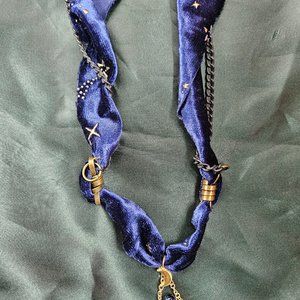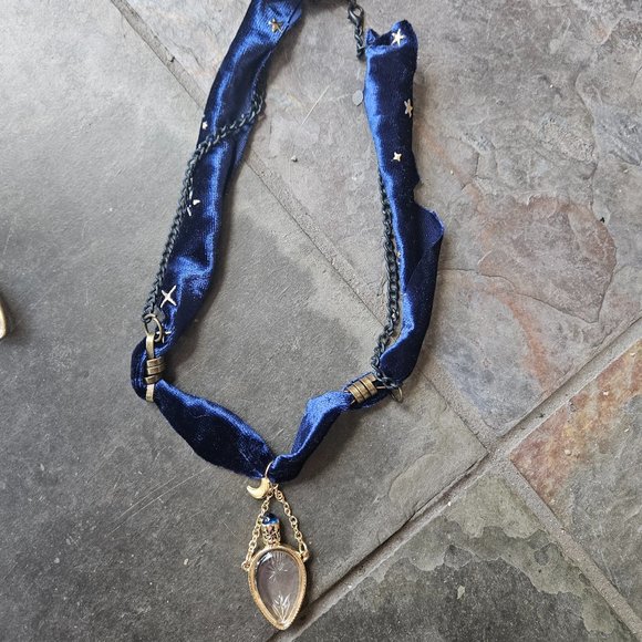 The velvet material is a dark blue with stars and moons has a black chain and little pendant with a moon.