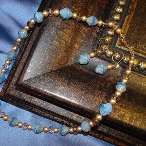 Ceca Celeste - Artisanal necklace/earring set in celestial blue with crystal and gold "pearl" embellishments; 18-inch necklace with 2-inch extender, earrings in hooks or leverbacks.