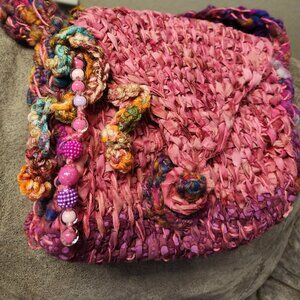 Pretty and unique style designed without pattern. One-off a kind crocheted with 3 strings of cotton, boutique strings and some wool to add 3D beauty. The shades of pinks are beautiful, and the handwork have the European flair. The closure button is handmade, and the beaded tassel is 4in long.