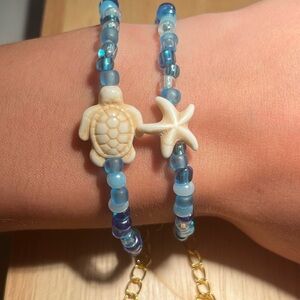 Handmade by me, these one of the kind bracelets are matching. You can keep them for yourself or share with a friend! One comes with a starfish charm and the second comes with a turtle charm! Blue glass seed bead on a strong fishing wire. These bracelets are not real gold so avoid water and harsh surfaces. Any questions please ask! I accept reasonable offers, if you’re interested please peak at my other listings!