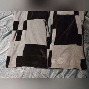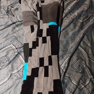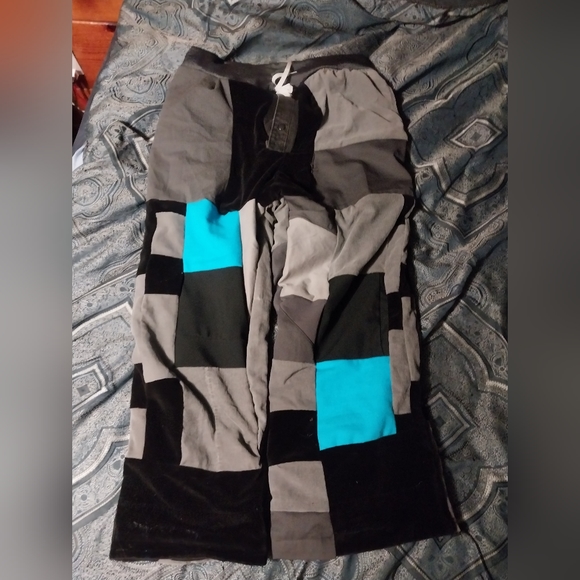 this pair of patchwork pants were made from scratch with grey corduroy, turquoise corduroy, and blk velour. baggy fit, deep pockets , drawstring waist, and hidden pockets. festival pants, hippie attire. years ago I used to sell a lot of these kinds of pants in my concert going days.no flaws. as seen in photo.