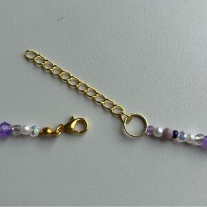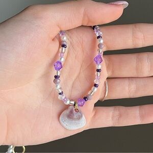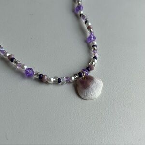 This necklace is one of a kind and handmade by me. It includes an assortment of purple, clear, and white beads with a shell pendant in the middle. The shell is a real shell that I collected from the beach myself, and the hole was naturally made by the ocean. The shell has a protective clearcoat to avoid any damage and is attached by a gold jump ring. This necklace has a gold lobster, claw clasp, and a gold chain for multiple sizes. If you like this piece, please check out my other items in my shop. If you have any questions please, I am happy to help.