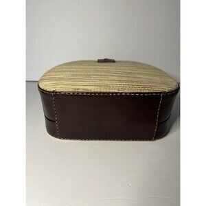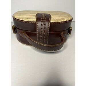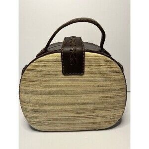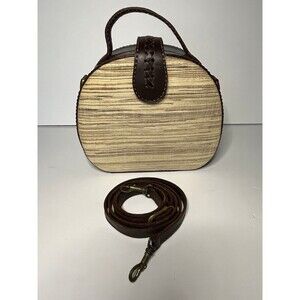 Beautiful handmade bag. Brown leather and rattan like fabric. Hard case. Crossbody strap 28 inch drop, adjustable to 25 inches. New never used. 8 1/2 in across, 8 in tall, 3 in wide.
