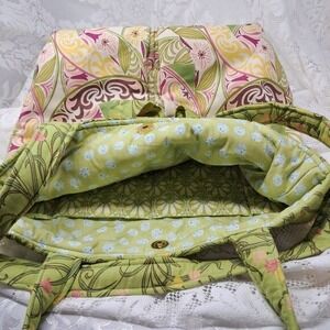 MEASURES 16 X 13 INCHES HANDMADE YELLOW AND LIME GREEN PAISLEY PRINT 2 OUTSIDE POCKETS 4 INSIDE POCKETS MAGNETIC CLOSURE SHOLDER DROP 15 INCHES QUILTED