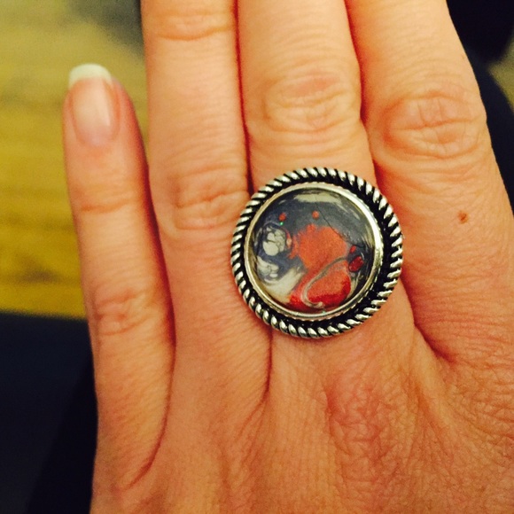 New without tags. Stunning silver color adjustable ring. Painted red blue and silver then resin overlay. One of a kind statement ring! Feel free to visit my shop at https://www.etsy.com/shop/TrendiTreazures