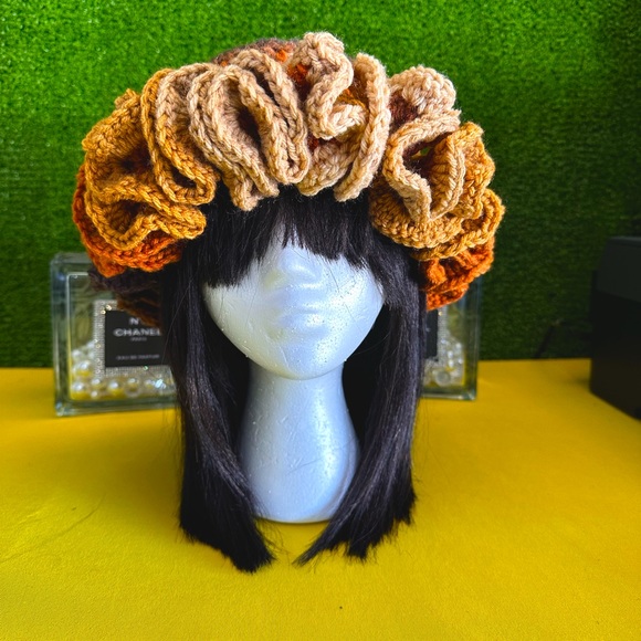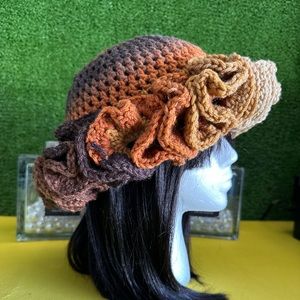 Brown, beige, orange, colorful, ruffle hat handmade by me one size fits most yarn is stretchy conforms to head