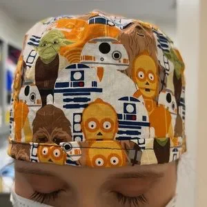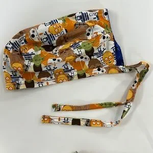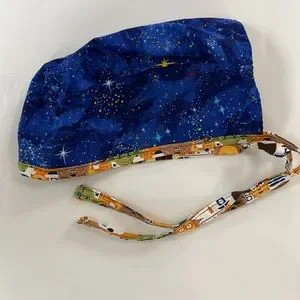 Reversible scrub cap. Hand made. Star wars on one side. Galaxy print on other side. Opening for ponytail. Tied with a knot. Sized for women’s head.