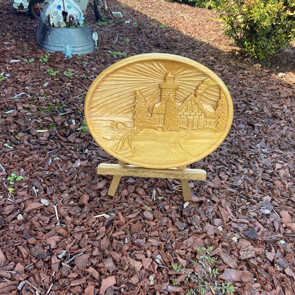 Solid wood handcrafted plaque with wooden stand. It also has hardware attached so that it can hang on a wall.