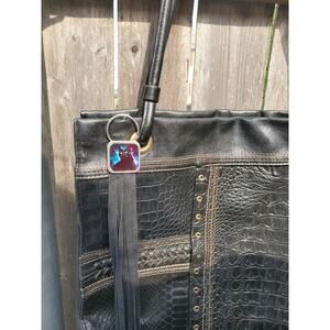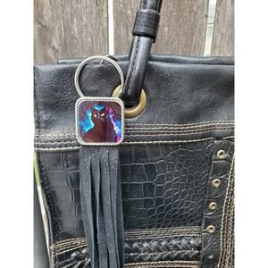 Handmade spooky cat boho Leather Fringe Western bag charm, Long fringe keychain