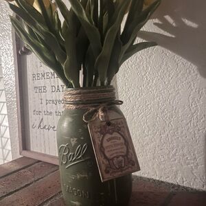 Handmade Spring decor , rustic style. This piece was hand painted and sealed w/wood tag and jute twine with IOD transfer. Jar is sealed to prevent chipping. Includes the life like faux tulips as well perfect for any style spring decor