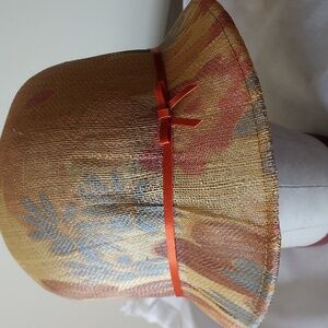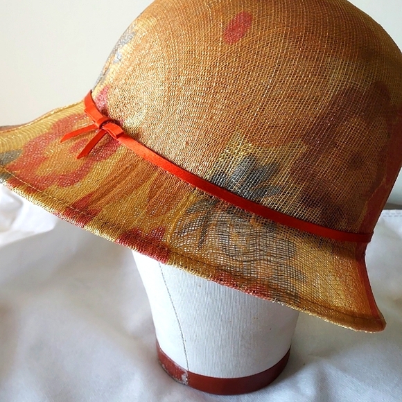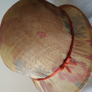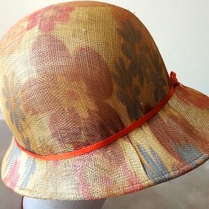 Bought at a small English countryside hat-making craft shop, this beautiful handmade straw cloche hat features fine straw craftsmanship showing subtle pleating for secure fit around the head and sweet orange ribbon that accents the colorful flowers imprinted on the straw. Fabulous summer, vintage style to accessorize your summer look. Mint condition!!