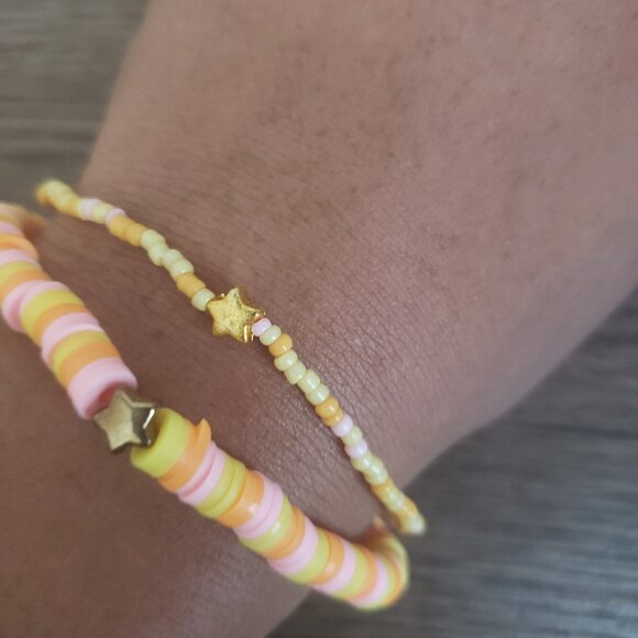 These pieces are made by me. They would be the perfect things to wear with a cute summer outfit. This set has Clay beads, Rice beads, and star beads.