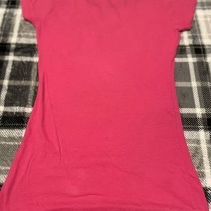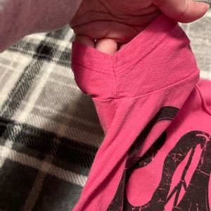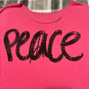 This is a hand pressed tee I made a while ago but only worn a few time material is so soft there no tag , cause I made it, it’s pretty pink with black writing Peace that looks worn but was done intentional. It looks like there’s white spots on bottom in pic but it must b the camera cause in person you can’t see them.