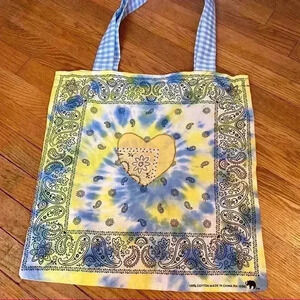 New boho tote bag with heart Handmade Hand Tie dyed tote bag Made with Bandana Great beach bag 19X19