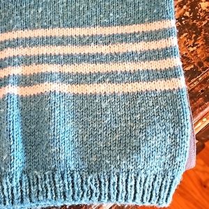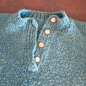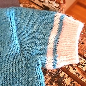 This is a handmade vintage child's pullover sweater in a turquoise with pink stripes and pearl buttons. Measures 13" across the width, and 15" from shoulder to hem. Has some pilling but still wearable and also a great piece for collectors.