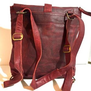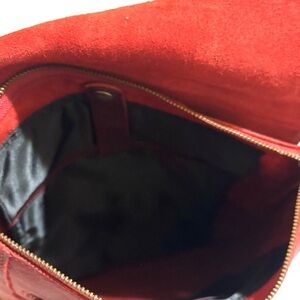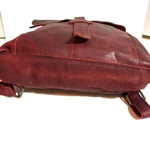 This stylish burgundy leather crossbody bag is perfect for any occasion. Its sleek design and rich color make it a versatile accessory for your wardrobe. 3 pockets at interior wall fabric lining 2 pockets under fabric at front exterior have marks scratches hight 13” wide 13” depth 3” strap drop 31 adjustable The dimensions are based on approximately measurements before placing an order please check take a moment to view all photos using feature for a closer look