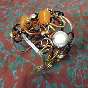 This is a beautiful, handmade wire and stones bracelet. It measures 2.5" (approx. diameter). It is easily adjusted to fit most wrist sizes. Feel free to ask any questions.