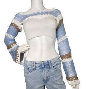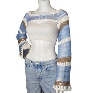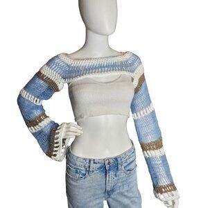Elevate your outfit with this handmade crochet mesh sleeve top, crafted with soft cotton and luxurious mohair yarn for a unique bohemian look. Featuring a delicate open-knit design, bold bell sleeves, and intricate detailing, this shrug-style top is the perfect layering piece for festivals, casual wear, or nights out.