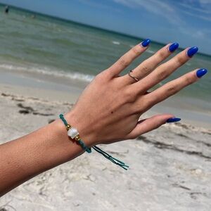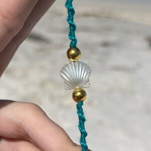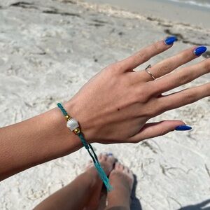 This bracelet was handmade by me! You can tie this bracelet on your wrist or I can add an adjustable slider for no extra charge! See pictures for measurements. It is made with teal embroidery floss, pearl shell bead, and gold beads. For more colors and styles I encourage you to check my other listings or comment/message me with any questions! I can do customs just let me know if you’re interested! Any questions please ask, I check my notifications every morning! I try to add new bracelets to my shop every couple days so follow me to see when I add new stuff!