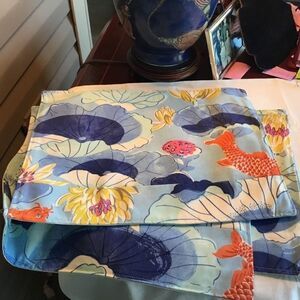 Brand new. Handmade of all new home decor fabrics. These 4 placemats are made from sun resistant fabric so they would work great outdoors as well as inside. They feature a lilly pond print in blues and olds and the back side is a solid cream.