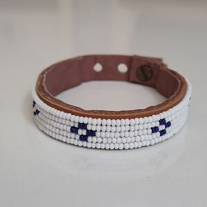 Handmade Beaded Snap Cuff Bracelet in a dark blue diamond pattern. Handmade by artisans on the Swahili Coast crafted from natural leather and lined with soft suede. Adjustable and fastened by a button stud closure.