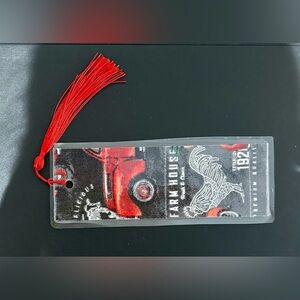 Vibrant bookmark with a red truck and rooster design. Ideal for book enthusiasts.