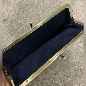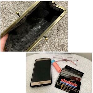 Brand new. Handmade from genuine leather with metal frame. It's very cute. Can hold reading glasses, pens, sunglasses, cosmetic items, keys, bank cards, coins.
