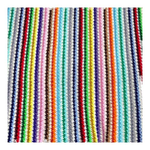 This handmade crochet blanket features a vibrant striped pattern with multicolor hues. Ideal as a cozy throw or an eye-catching addition to home decor.