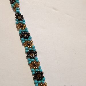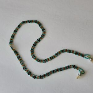 Handmade crocheted beaded eyeglass lanyard. turquoise and gold in color